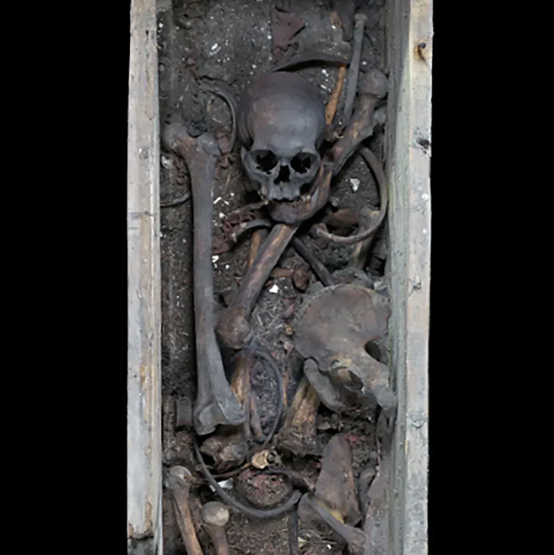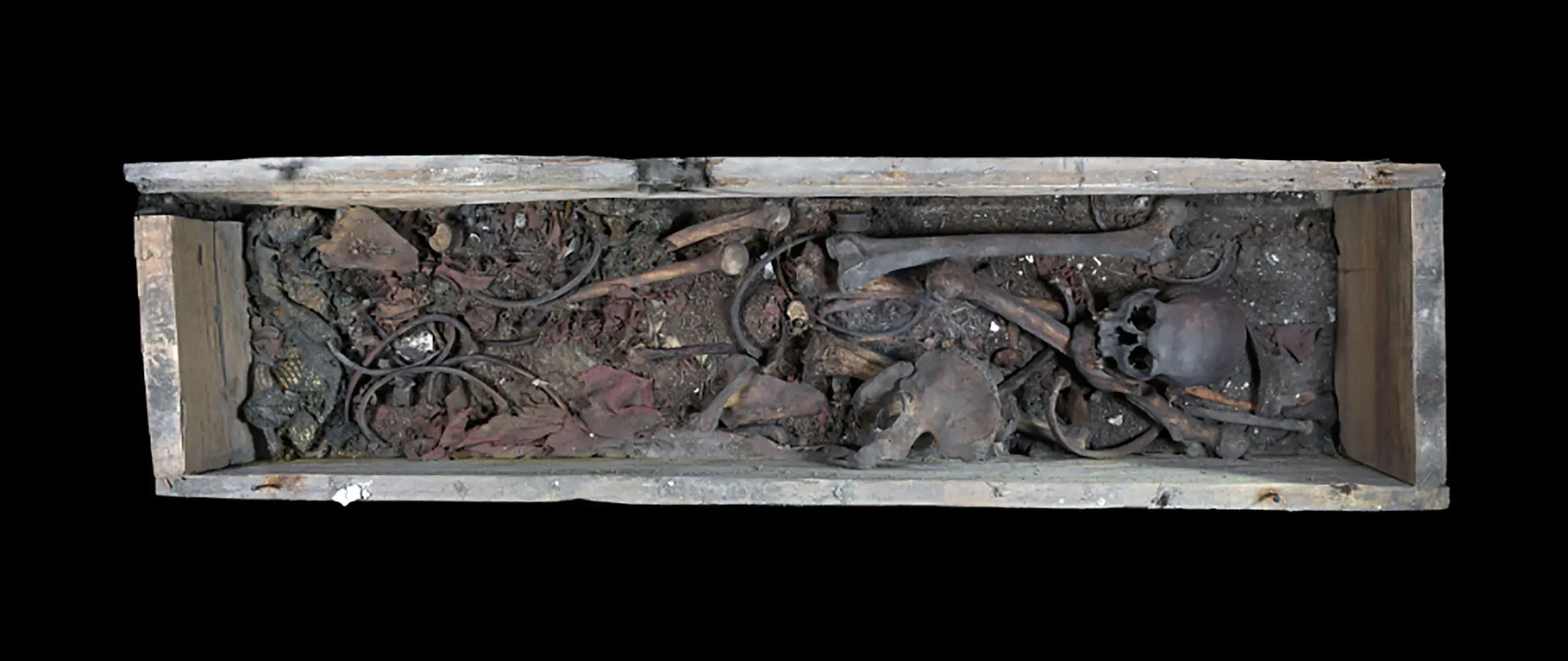 Innerhalb des Holzsarges fanden sich durcheinander liegende textile und pflanzliche Reste, Sediment und Gebeine. Von Mitte Juni 2025 bis Anfang Februar 2026 wurde dieser Befund ausführlich dokumentiert und der Inhalt des Sarges nach und nach entnommen.